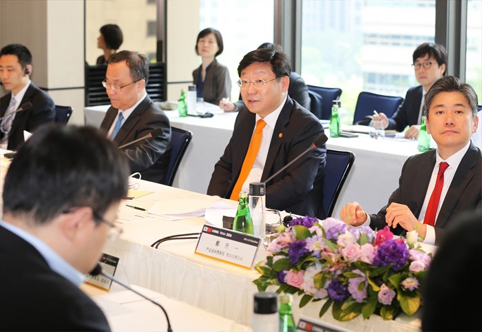 이날 회의에는 징동(JD.com, 중국 2위 전자상거래 기업), 안방보험(동양생명, 알리안츠생명 인수) 등 중국 유력기업 11개사와 김용국 코트라 Invest Korea 대표, 위하이엔 중국 국제무역촉진위원회(CCPIT) 한국대표가 참석했다. <사진제공=산업통상자원부>