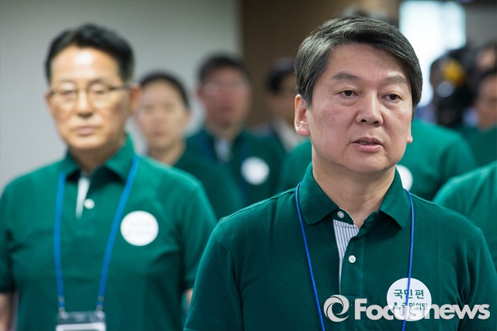 (양평=포커스뉴스) 안철수(오른쪽) 국민의당 상임공동대표와 20대 총선 당선인들이 26일 오후 경기도 양평 한화리조트에서 열린 워크숍에 참석해 애국가를 제창하고 있다. 왼쪽은 박지원 의원.