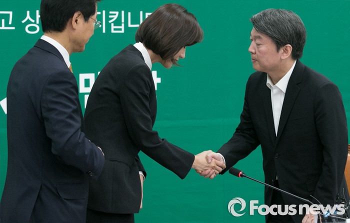 (서울=포커스뉴스) 2일 오전 서울 여의도 국회에서 열린 국민의당 최고위원회의에 국민대표 직함으로 참석한 故 가수 신해철의 아내 윤원희(가운데) 씨가 '의료사고 피해구제 및 의료분쟁 조정 등에 관한 법률 일부개정법률안(일명 신해철법)' 처리를 호소한 뒤 퇴장하며 안철수(오른쪽) 상임공동대표와 악수하고 있다. 왼쪽은 천정배 공동대표.