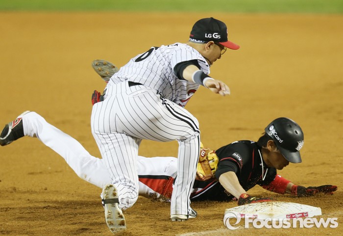 (서울=포커스뉴스) 29일 서울 잠실구장에서 열린 2016 프로야구 kt-LG 경기 7회초 1사 1루에서 kt 1루주자 심우준이 LG 투수 유원상의 견제구에 태그 아웃되고 있다.