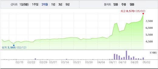보성파워텍은 2거래일 연속 상승세에 이어 이날도 상승 흐름을 이어가고 있다. 보성파워텍은 2일 오전 9시46분 현재 전일 대비 11.13%(840원) 상승한 8390원에 거래되고 있다. 이는 4월초 주가(4975원)와 비교했을 때 1.6배 상승한 수치다.