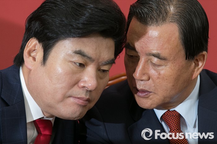 (서울=포커스뉴스) 원유철(왼쪽) 새누리당 대표최고위원 권한대행과 홍문표 제1사무부총장이 29일 오전 서울 여의도 국회에서 열린 원내대책회의에 참석해, 대화하고 있다.