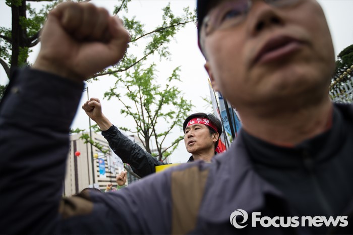 (서울=포커스뉴스) 27일 오후 서울 종로구 정부종합청사 앞에서 전교조(전국교직원노동조합)와 민주교육과 전교조 지키기 전국행동의 주최로 법외노조 후속조치 규탄 및 부당해고 저지, 노동기본권 쟁취를 위한 집회가 열리고 있다.
