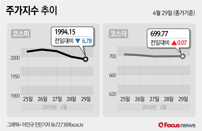 (서울=포커스뉴스) 29일 코스피지수는 전날 보다 0.34%(6.78포인트) 내린 1994.15에 장을 마쳤다. 코스닥지수는 전일 대비 0.01%(0.07포인트) 오른 699.77에 마감했다.