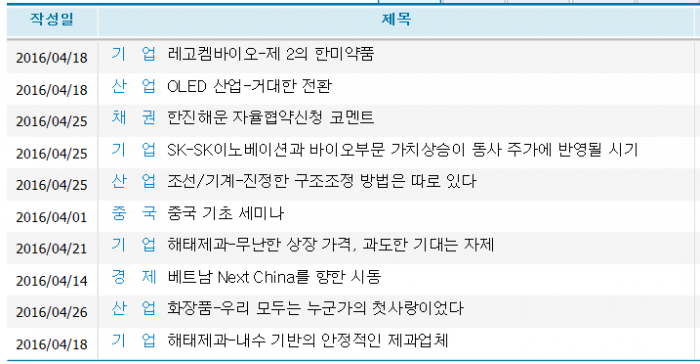 코스닥에서는 중국에서 성장 기대가 커지는 전기차 관련주 엔에스와 높은 기술력을 보유하고 있다는 평가를 받은 한올바이오파마와 기가레인이 증권사 추천을 받았다.지난주(4월22일~28일) 증시 참여자들은 향후 산업 구조조정과 관련 큰 이슈를 가지고 있는 조선·해운업종을 주목했다(자료제공=에프앤가이드)현대중공업 지난 3개월간 주가 흐름(차트출처=네이버금융)한진해운 지난 3개월간 주가 흐름(차트출처=네이버금융)유진투자증권 화장품산업 보고서(자료출처=유진투자증권)이번 주(5월1일~4일)는 1분기에 이어 2분기 실적성장이 가능한 거래소 종목들이 증권사 추천을 받았다(자료제공=각 증권사)네이버 지난 3개월간 주가 흐름(차트출처=네이버금융)이번 주(5월1일~4일) 코스닥에서는 기술력을 보유한 종목들이 증권사 추천을 받았다(자료제공=각 증권사)