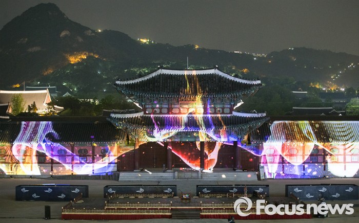(서울=포커스뉴스) 29일 저녁 서울 경복궁 흥례문 광장에서 열린 제 2회 궁중문화축전 개막제에서 경복궁의 역사를 빛으로 담아낸 '미디어 파사드' 공연이 시선을 사로잡고 있다. '오늘, 궁을 만나다'를 주제로 열리는 2016년 궁중문화축전은 다채로운 프로그램들과 함께 5월 8일까지 열린다.