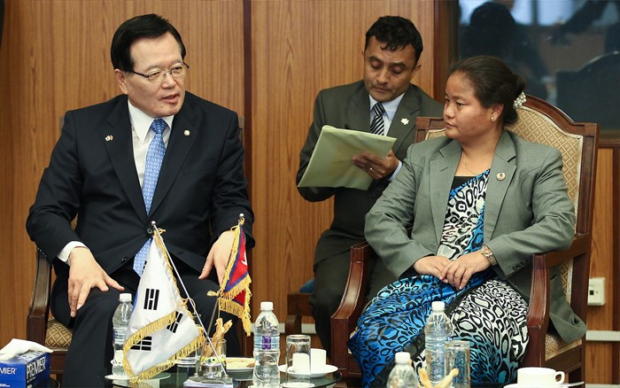 (서울=포커스뉴스) 정의화(왼쪽) 국회의장이 25일 오전(현지시각) 카트만두 네팔 국회에서 머거르(Onsari Gharti Magar) 국회의장을 만나 환담하고 있다. 양국은 우호증진과 경제협력 확대방안 등을 논의했다. <사진제공=국회>