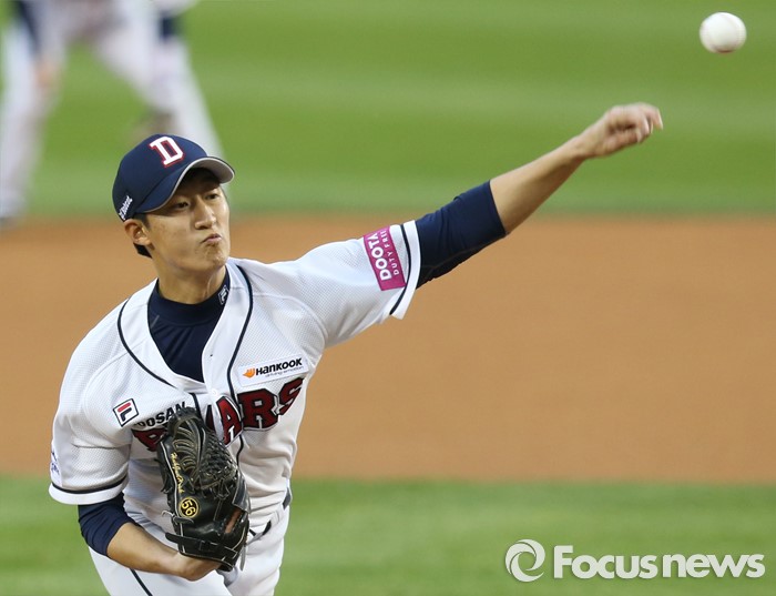 (서울=포커스뉴스) 27일 서울 잠실구장에서 열린 2016 프로야구 SK-두산 경기에서 1회초 두산 선발투수 허준혁이 투구하고 있다.