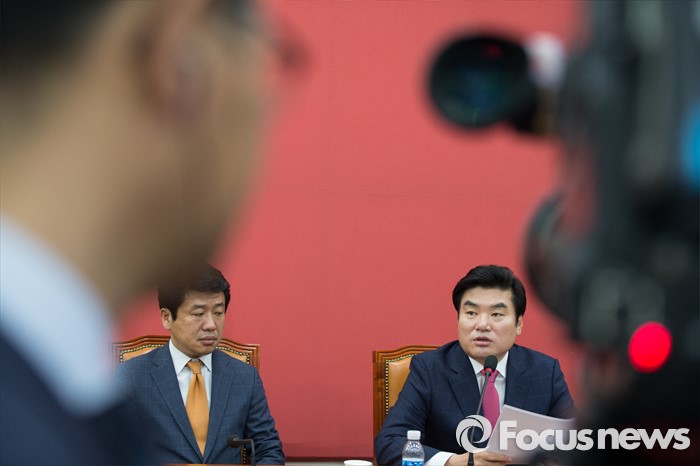 (서울=포커스뉴스) 원유철(오른쪽) 새누리당 대표최고위원 권한대행이 2일 오전 서울 여의도 국회에서 마지막 원내대책회의를 마친 후 기자회견을 갖고 있다.