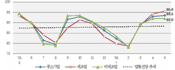 업종별로는 제조업이 전월대비 1.2p 상승한 95.6이었으며, 비제조업은 전월과 동일한 92.0으로 제조업이 보다 긍정적인 전망을 보였다.