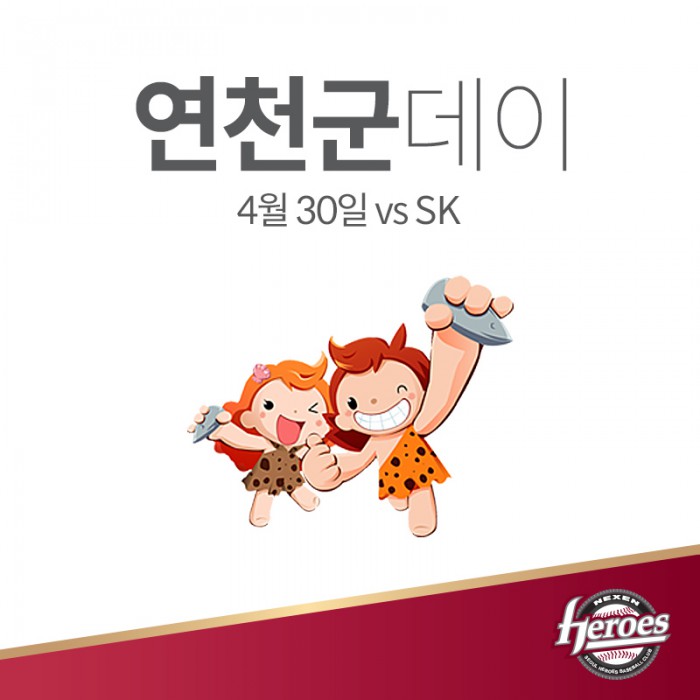 경기 연천군은 넥센 구단 후원사 중 하나다. 넥센은 경기 중 '연천 구석기축제' 홍보영상을 상영하고, '원시인 퍼포먼스'를 선보인다. 시구자로 김규선 연천군수가, 시타자로 독립구단 연천 미라클 김인식 감독이 각각 나선다.프로야구 넥센이 30일 고척돔에서 열리는 SK와의 경기에 '연천군데이' 행사를 연다. 사진은 행사 포스터. <사진제공=넥센 히어로즈>