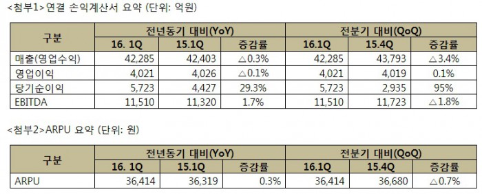 ARPU(가입자당 평균매출) 역시 3만6414원으로 직전분기보다 0.7% 떨어졌다.