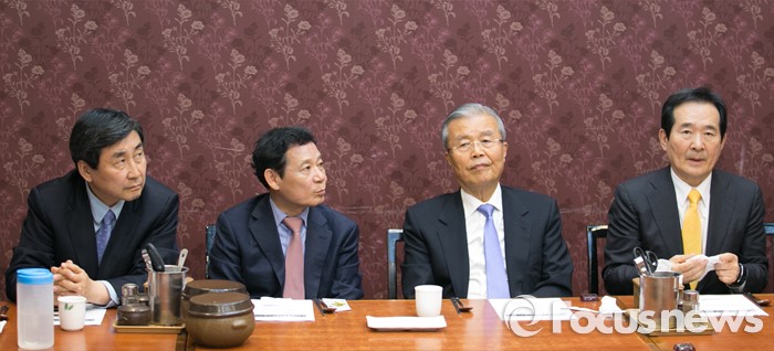 (광주=포커스뉴스) 김종인 더불어민주당 비대위 대표와 20대 총선 당선 및 낙선 인사들, 윤장현 광주시장 등이 25일 오후 광주의 한 음식점에서 당지도부·출마자·단체장 오찬 간담회를 하고 있다. 왼쪽부터 이종걸 원내대표, 윤 시장, 김 대표, 정세균 의원.