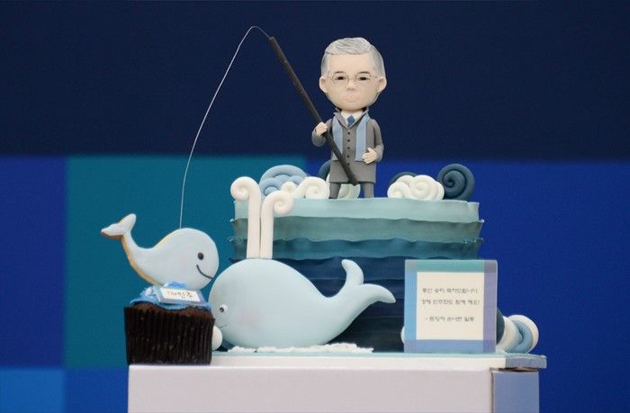 (서울=포커스뉴스) 26일 오후 서울 여의도 국회 대표회의실에 김종인 더불어민주당 비대위 대표의 팬클럽 '트잉여 손녀팬' 소속 회원들이 선물한 케이크가 놓여 있다. <사진제공=더불어민주당>