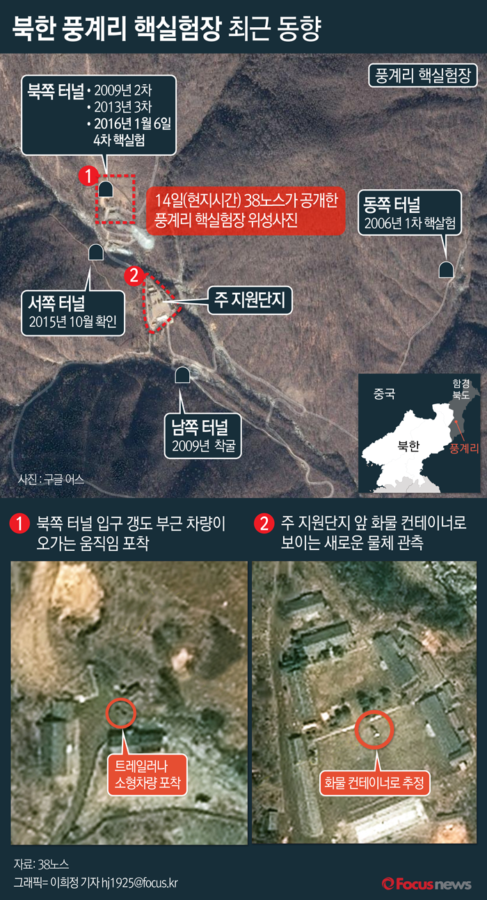 문 대변인은 이어 북한 풍계리 핵실험장 동향에 대해 "미국의 북한 전문매체인 38노스가 풍계리 위성사진을 계속 찍고 있는데, 기습적인 핵실험을 강행할 경우 즉시 이를 알아내기는 쉽지 않다"면서 "현재 풍계리의 모습이 핵실험 준비를 끝낸 후인지는 불분명하지만 북한은 언제든 기습적으로 핵실험을 할 수 있는 것으로 판단된다"고 설명했다.(서울=포커스뉴스) 38노스에 따르면 지난 4월 14일 북한 함경북도 풍계리 핵실험장의 북쪽 터널 갱도입구 부근을 촬영한 위성사진에 차량용 트레일러 또는 소형 차량으로 추정되는 소형 물체가 포착됐으며 주 지원 단지에서는 선적 컨테이너나 장비 트레일러로 추정되는 물체가 포착됐다. 2016.04.19 이희정 기자