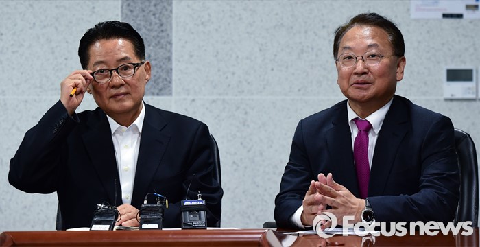 (서울=포커스뉴스) 박지원(왼쪽) 국민의당 원내대표가 29일 오전 서울 여의도 국회 의원회관에서 경제활성화법안 등 처리 요청을 위해 방문한 유일호 경제부총리 겸 기획재정부 장관과 면담을 하고 있다.