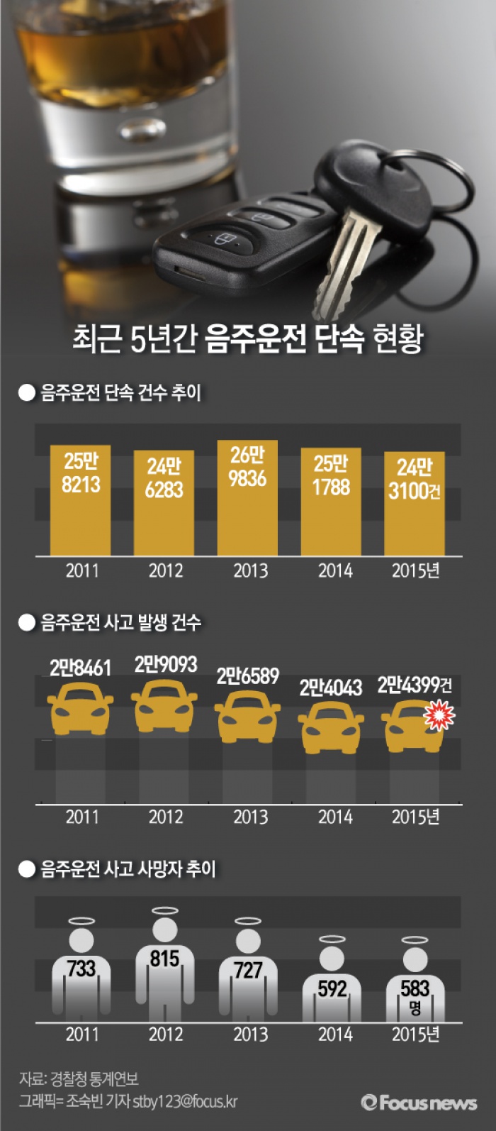 (서울=포커스뉴스) 경찰청 통계연보에 따르면 최근 5년간(2011~2015년) 음주운전 단속 건수는 25만 건을 웃돌고 있으며, 음주운전으로 인한 사고 발생건수도 2~3만 건에 달하는 것으로 나타났다.