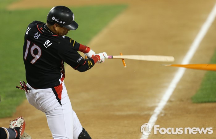 (서울=포커스뉴스) 29일 서울 잠실구장에서 열린 2016 프로야구 kt-LG 경기 7회초 kt 선두타자 김상현이 스윙 도중 배트가 쪼개지고 있다.