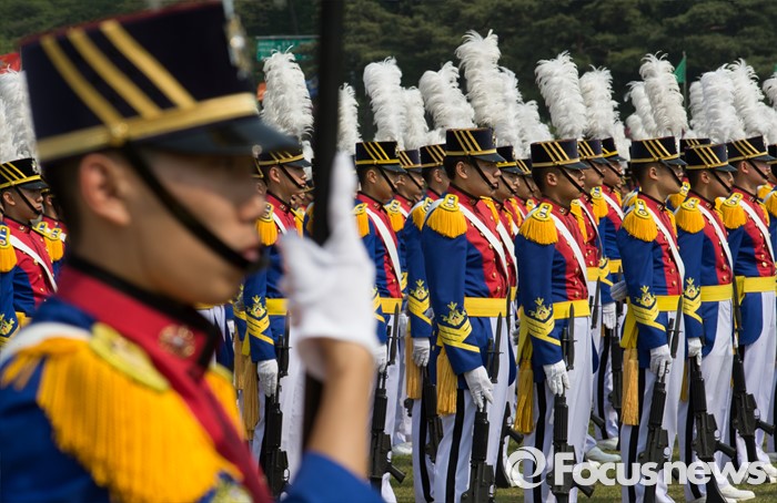 (서울=포커스뉴스) 29일 오후 서울 노원구 육군사관학교에서 열린 개교 70주년 기념식에서 생도들이 도열하고 있다.