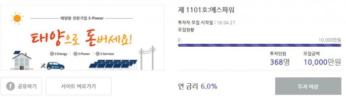 태양광 전문 기업 에스에너지의 자회사 '에스파워'는 P2P 대출 업체 8퍼센트와 지난 27일 진행한 태양광 투자 상품을 3시간22분만에 판매 완료했다고 28일 밝혔다.