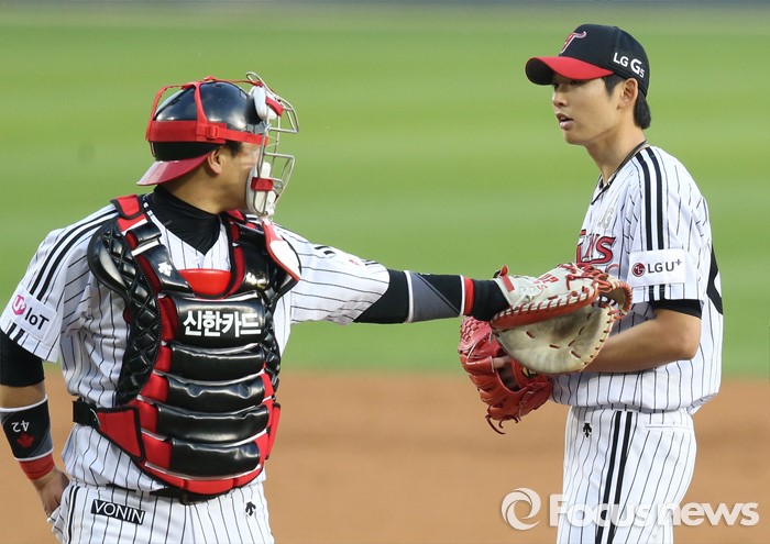 (서울=포커스뉴스) 29일 서울 잠실구장에서 열린 2016 프로야구 kt-LG 경기 1회초 1사후 LG 선발투수 이준형이 3연속 볼넷으로 베이스를 채우자 포수 정상호가 마운드에서 이준형을 격려하고 있다.