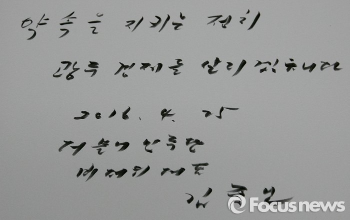 (광주=포커스뉴스) 김종인 더불어민주당 비대위 대표가 25일 오후 광주과학기술원(GIST, 지스트)을 방문해 문승현 총장 등 관계자들과 간담회를 가졌다. 사진은 김 대표가 남긴 방명록.