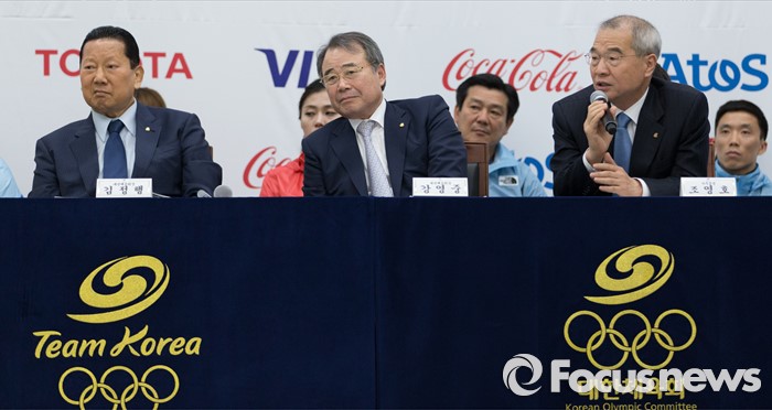 (서울=포커스뉴스) 27일 오후 서울 노원구 태릉선수촌에서 제31회 리우하계올림픽대회 D-100일 미디어데이에 참석한 조영호(오른쪽) 대한체육회 사무총장이 박태환 선수와 관련된 질문에 답하고 있다.