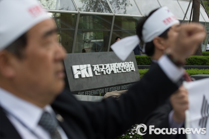 (서울=포커스뉴스) 26일 오후 서울 영등포구 전경련회관 앞에서 애국국민운동대연합 회원들이 어버이연합 억대 금품지원 규탄 기자회견을 하고 있다.