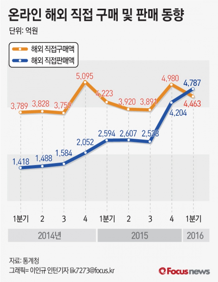 (서울=포커스뉴스) 통계청이 2일 발표한 '1분기 온라인 해외 직접 구매 및 판매 동향'을 보면 1분기 온라인 해외 직접판매액은 4787억원으로 전년 동기 대비 84.5% 증가했다. 해외 직접구매액은 4463억원으로 전년 동기 대비 5.7% 늘었다.