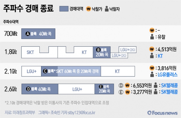 (서울=포커스뉴스) 미래창조과학부는 2일 진행된 2일차 주파수경매에서 최종 낙찰자가 결정돼 경매가 종료됐다고 발표했다. 1.8㎓ 대역은 KT, 2.1㎓ 대역은 LG유플러스, 2.6㎓ 대역은 SK텔레콤이 차지했으며 총 낙찰가는 2조1106억원이었다.