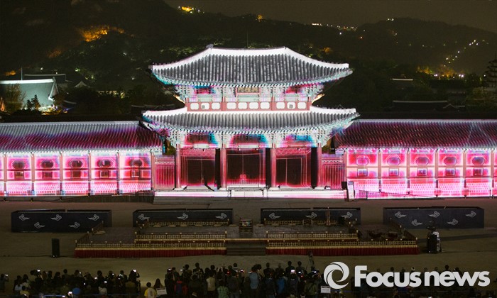 (서울=포커스뉴스) 29일 저녁 서울 경복궁 흥례문 광장에서 열린 제 2회 궁중문화축전 개막제에서 경복궁의 역사를 빛으로 담아낸 '미디어 파사드' 공연이 시선을 사로잡고 있다. '오늘, 궁을 만나다'를 주제로 열리는 2016년 궁중문화축전은 다채로운 프로그램들과 함께 5월 8일까지 열린다.