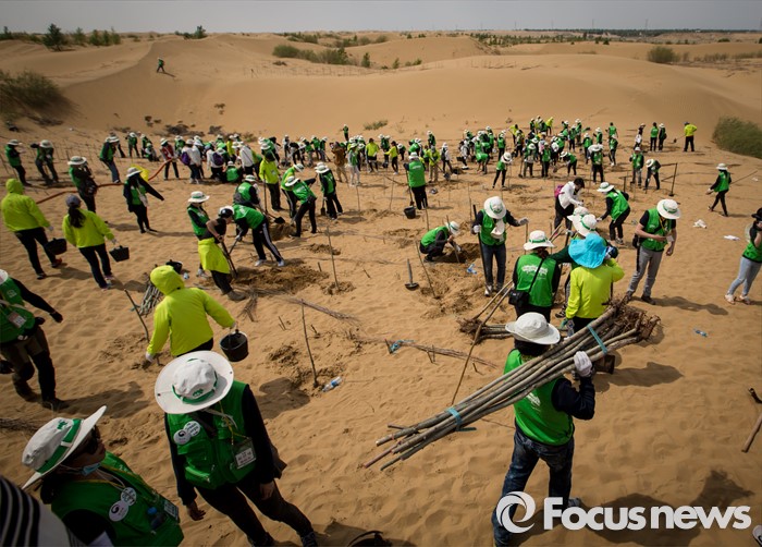 (다라더치/중국=포커스뉴스) 25일 오후 중국 내몽고 다라더치 쿠부치사막에서 2016 미래숲 15기 녹색봉사단원들이 나무 심기 작업을 하고 있다. 미래숲 녹색봉사단은 이번 봉사활동을 통해 황폐화된 사막에 나무 심기 및 각국 청년들과 우호를 증진을 위한 교류 활동을 전개했다.