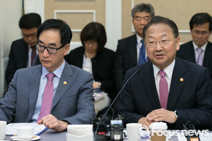 (서울=포커스뉴스) 유일호(오른쪽) 경제부총리가 27일 오전 서울 여의도 국회 귀빈식당에서 열린 청년 · 여성 일자리대책 당정협의에 참석해, 발언하는동안, 이준식 사회부총리가 생각에 잠겨 있다.