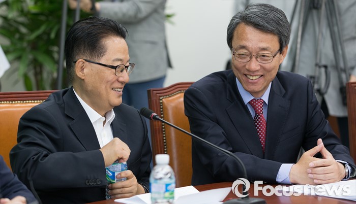(서울=포커스뉴스) 박지원(왼쪽) 국민의당 원내대표와 김성식 정책위의장이 29일 오전 서울 여의도 국회에서 최고위원회의에 참석해 대화하고 있다.