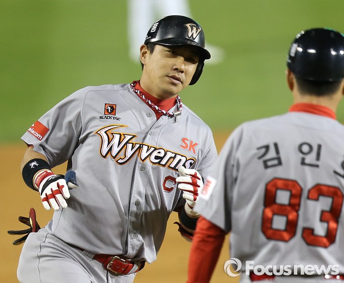(서울=포커스뉴스) 27일 서울 잠실구장에서 열린 2016 프로야구 SK-두산 경기 5회초 SK 선두타자 김강민이 좌월 솔로 홈런을 치고 3루를 돌며 김인호 코치의 환영을 받고 있다.
