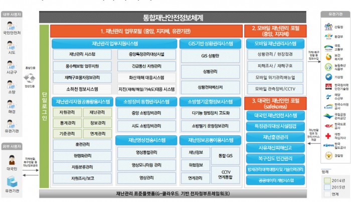 박인용 국민안전처 장관은 "이번 사업으로 범정부적인 재난관리 시스템의 기반은 마렸했으나 전국의 상황관리를 위해 중앙과 지방자치단체 간 재난정보 공유체계를 마련하는 등 보완이 필요하다"며 "지속해서 시스템을 보완해 국민에 양질의 재난안전 서비스를 제공할 수 있도록 노력하겠다"고 밝혔다.국민안전처가 그간 따로 운영됐던 19종의 재난관련시스템을 '대국민 재난안전 포털' 하나로 통합·운영한다. 사진은 통합재난안전정보체계의 구축 구성도. <사진제공=국민안전처>
