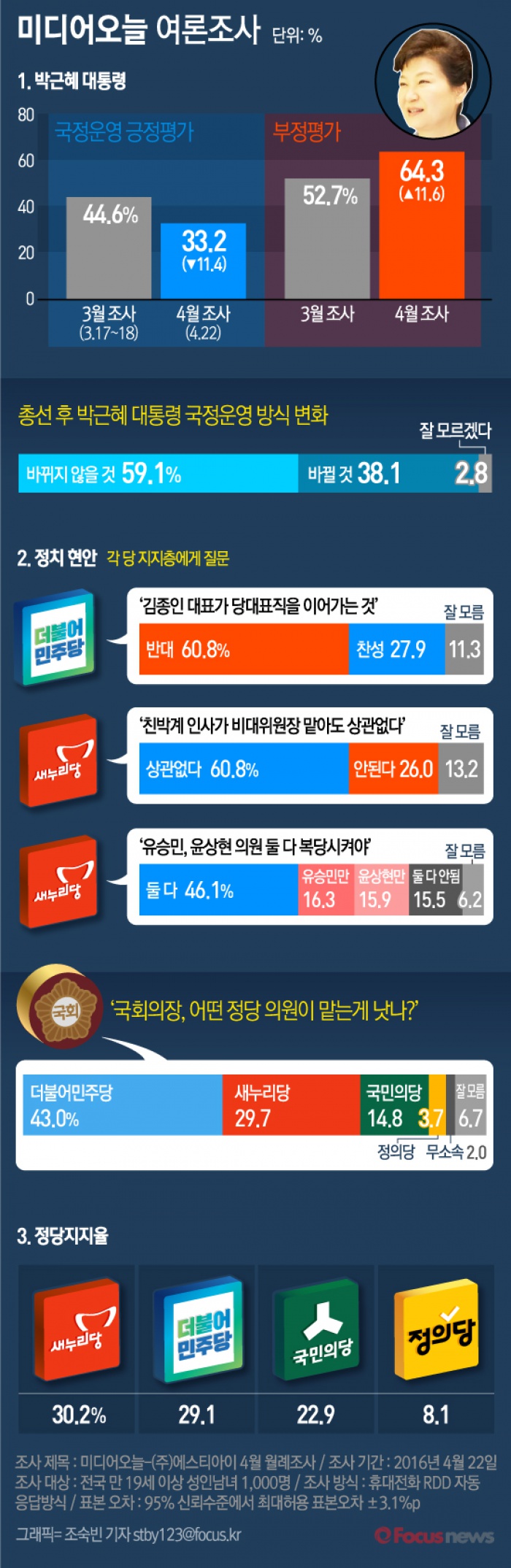 (서울=포커스뉴스) 미디어오늘과 여론조사기관 (주)에스티아이가 4월22일 박근혜 대통령, 정치 현안, 정당 지지율에 대한 여론조사를 실시한 결과를 발표했다.