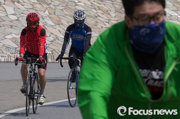(서울=포커스뉴스) 전국이 대체로 맑지만 황사와 미세먼지가 극성을 부리는 25일 서울 서초구 반포한강공원에서 시민들이 마스크를 착용한채 자전거를 타고 있다.