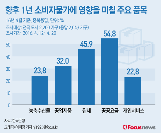 (서울=포커스뉴스) 27일 한국은행은 '2016년 4월 소비자동향조사 결과'에 따르면 향후 1년간 소비자물가에 영향을 미칠 주요 품목(복수 응답 가능)으로는 공공요금 54.8%, 집세 45.9%, 공업제품 32.0% 차례로 응답했다.