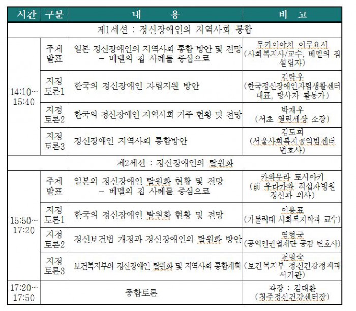 포럼의 제1세션에서는 △정신장애인 자립지원 △정신장애인 지역사회 거주 현황 및 전망 등 지역사회 통합을 위한 대책이 논의된다.