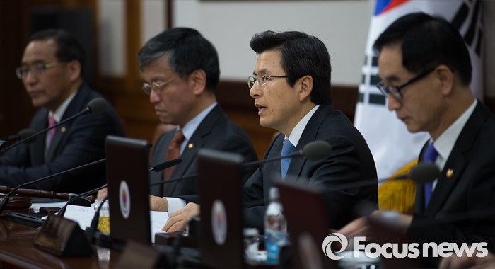 (서울=포커스뉴스) 황교안(오른쪽 두번째) 국무총리가 3일 오전 서울 종로구 정부서울청사에서 열린 국무회의에 자리해 모두발언 하고 있다.