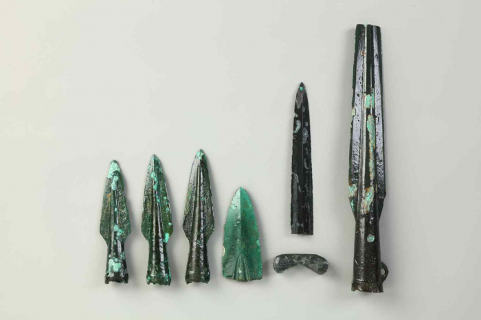 ☞청동 새기개(銅鉈): 끌의 한 종류로, 앞쪽이 뾰족하여 새기개로 주로 사용충남 부여군 세도면 청송리 35-42번지 일대에서 발굴된 청동 무기류 일괄.<사진제공=문화재청>