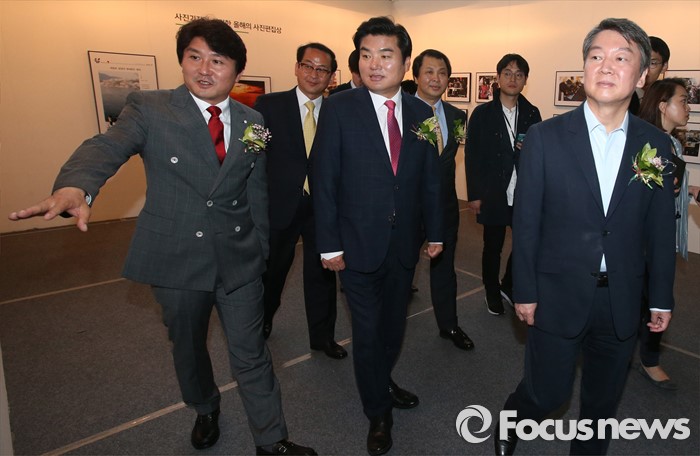(서울=포커스뉴스) 3일 오전 서울 강남구 코엑스에서 열린 '52회 한국보도사진전 개막식'에 참석한 안철수(오른쪽) 국민의당 상임공동대표, 원유철(가운데) 새누리당 원내대표가 이동희 사진기자협회장의 안내를 받으며 전시된 사진을 관람하고 있다. '찰나의 기록, 시대의 진실'을 주제로 진행된 이번 전시는 시대의 진실을 기록한다는 사명감으로 역사의 현장을 묵묵히 지키며 취재한 수백만 컷 중 선정된 150여점과 '현장의 사진기자', '역대 대상 수상작' 등 250여점의 사진이 전시된다.