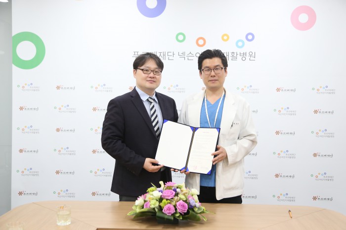 병원 건립을 위해 고(故) 박완서 소설가를 비롯해 정호승 시인, 성악가 조수미, 가수 션, 이지선 작가, 축구선수 이근호 등 시민 1만여 명과 500여 개 기업·단체들이 325억 원을 모금해 화제된 바 있다.숙명여자대학교 신동식 화공생명공학부 교수(사진 왼쪽)와 푸르메재단 넥슨어린이재활병원 백한승 치과원장이 3일 재활병원 대회의실에서 협약을 맺은 뒤 기념사진을 찍고 있다. <사진제공=숙명여자대학교>