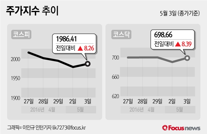 (서울=포커스뉴스) 3일 코스피지수는 전날 보다 0.42%(8.26포인트) 오른 1986.41에 장을 마쳤다. 코스닥지수는 전일 대비 1.22%(8.39포인트) 오른 698.66에 마감했다.