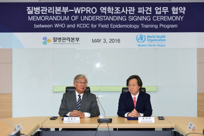 (청주=포커스뉴스) 정기석(오른쪽) 질병관리본부장이 3일 충북 청주 질병관리본부에서 신영수 세계보건기구(WHO) 서태평양지역 사무처(WPRO) 사무처장과 인적 교류 등을 위한 업무 협약을 하고 있다. <사젠제공=질병관리본부>