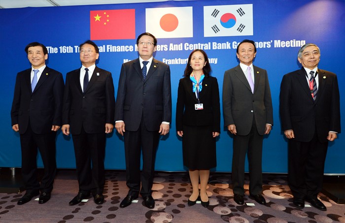 (서울=포커스뉴스) ADB연차 총회 참석차 독일 프랑크푸르트를 방문 중인 유일호 부총리 겸 기획재정부 장관이 5월 3일(현지시간) 메리어트호텔에서 열린 제16차 한·중·일 재무장관회의에 참석하여, 기념촬영을 하고 있다. 왼쪽부터이주열 한은총재, 유일호 부총리, 러우지웨이 중국재무장관. <사진제공=기획재정부>