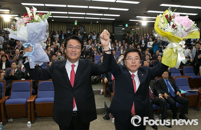 (서울=포커스뉴스) 3일 오후 서울 여의도 국회에서 열린 새누리당 20대 국회 첫 원내대표 및 정책위의장 선출을 위한 당선자 총회에서 선출된 정진석(왼쪽) 신임 원내대표와 김광림 신임 정책위의장이 취재진을 향해 포즈를 취하고 있다.