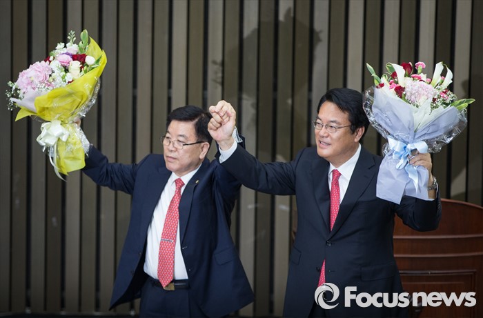 (서울=포커스뉴스) 3일 오후 서울 여의도 국회에서 열린 새누리당 20대 국회 첫 원내대표 및 정책위의장 선출을 위한 당선자 총회에서 선출된 정진석(오른쪽) 신임 원내대표와 김광림 신임 정책위의장이 취재진을 향해 포즈를 취하고 있다.