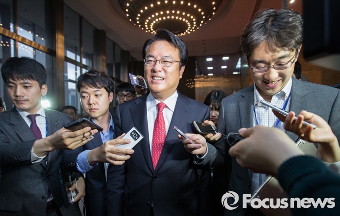 (서울=포커스뉴스) 3일 오후 서울 여의도 국회에서 열린 새누리당 20대 국회 첫 원내대표 및 정책위의장 선출을 위한 당선자 총회에서 신임 원내대표로 선출 된 정진석 후보가 기자들의 질문을 받으며 회의장을 빠져 나오고 있다.